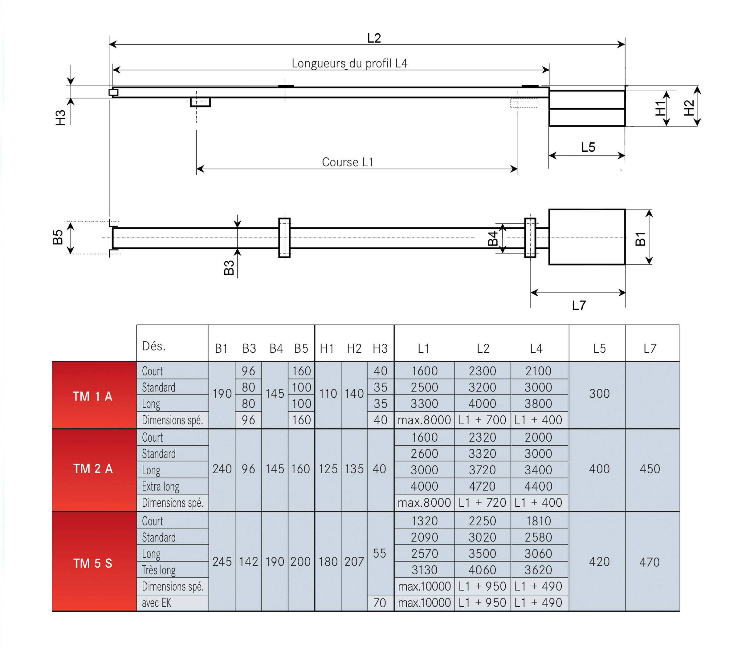 Dimensions intermédiaires et extension sur demande, Course max. 1 000cm
